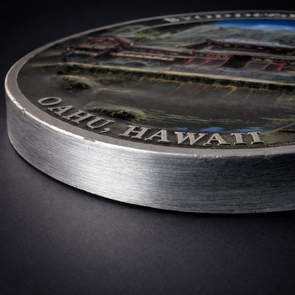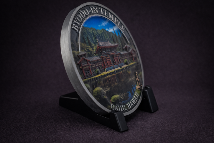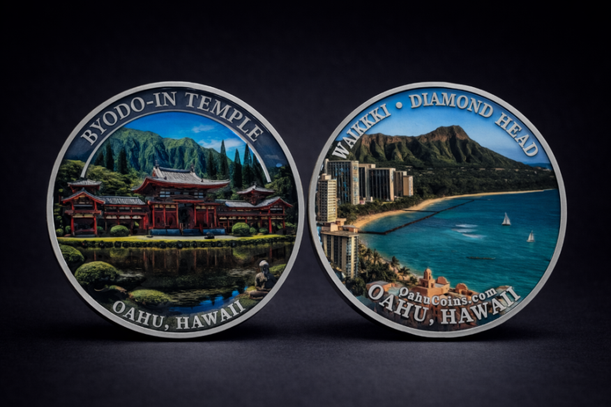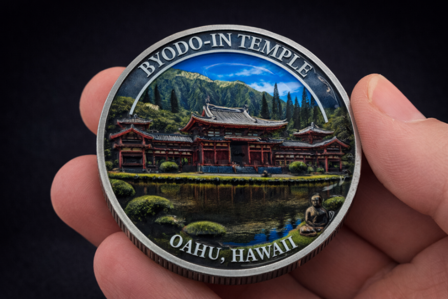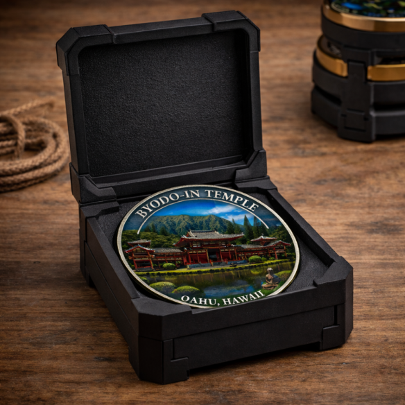 Created as a physical memory object, the Byodo-In Temple coin captures the quiet presence of one of the island’s most peaceful locations. It is designed to reflect not just the structure itself, but the feeling of being there — still, quiet, and removed from everything else.